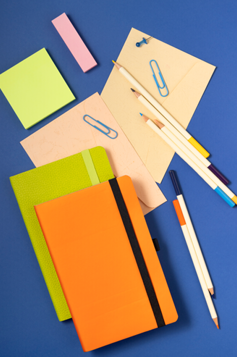 Bloco de anotações plástico com autoadesivos e wire-o, contém cinco blocos autoadesivos coloridos com aproximadamente 25 folhas cada.