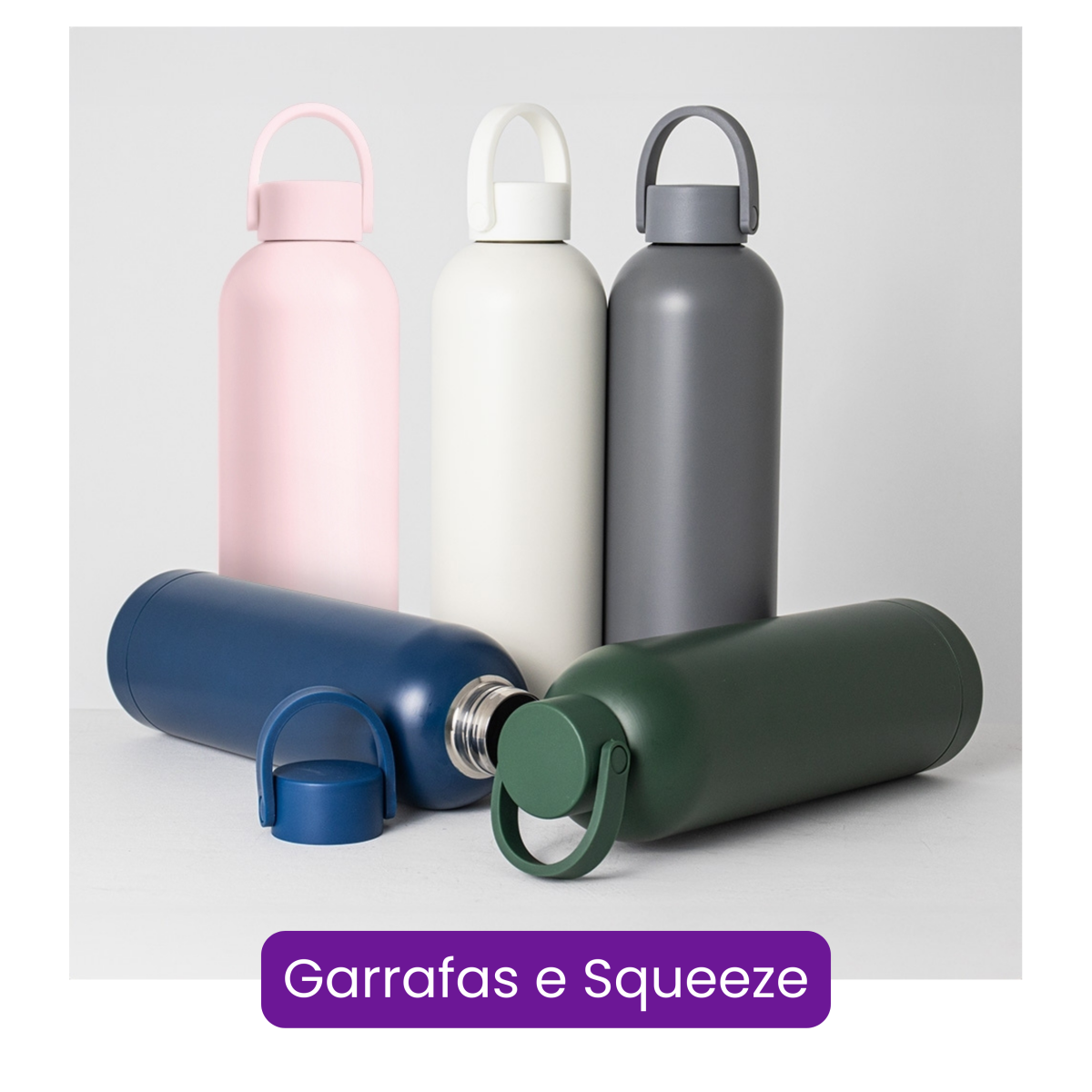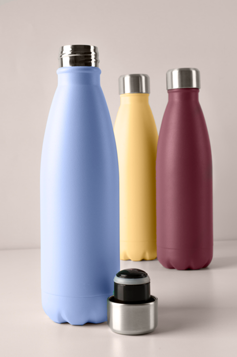 Copo térmico de inox com acabamento liso e capacidade 500ml, material livre de BPA. Contém tampa com abridor.